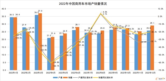 2022年中國(guó)工程機(jī)械行業(yè)主要產(chǎn)品銷量情況(單位:臺(tái),%)? (e-works整理,數(shù)據(jù)來源:中國(guó)工程機(jī)械工業(yè)協(xié)會(huì))? 根據(jù)中國(guó)汽車工業(yè)協(xié)會(huì)的統(tǒng)計(jì)數(shù)據(jù),2022年我國(guó)商用車產(chǎn)銷分別完成318.5萬輛和330萬輛,同比下降31.9%和31.2%,呈現(xiàn)兩位數(shù)下滑。