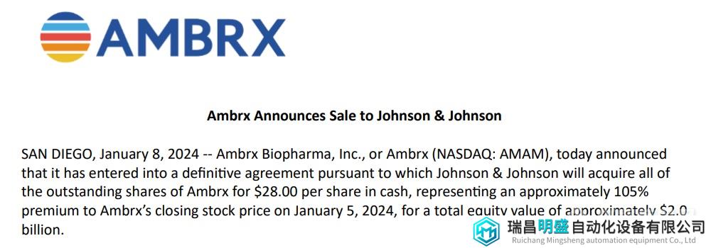 美國時(shí)間1月8日凌晨,強(qiáng)生公司宣布達(dá)成對Ambrx Biopharma(安博生物)的最終收購協(xié)議。強(qiáng)生將以每股28美元的價(jià)格現(xiàn)金收購Ambrx,該價(jià)格較今年1月5日收盤溢價(jià)約105%,總股權(quán)價(jià)值約為20億美元。