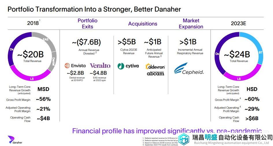 2018年,丹納赫營(yíng)收約為200億美元,65%的收入來(lái)生命科學(xué)和診斷終端市場(chǎng),45%來(lái)自牙科、環(huán)境和應(yīng)用解決方案業(yè)務(wù)。2019年丹納赫剝離牙獨(dú)立公司“Envista”,2023丹納赫環(huán)境業(yè)務(wù)拆分上市 定名“Veralto”,并且收購(gòu)cytiva、Abcam等公司不斷擴(kuò)大終端市場(chǎng),在2023年總營(yíng)收預(yù)計(jì)達(dá)到240億。Blair表示,丹納赫這幾年經(jīng)過(guò)不斷的整合收購(gòu),營(yíng)業(yè)利潤(rùn)率由2018年的20%增長(zhǎng)至40%,與疫情前相比,財(cái)務(wù)狀況顯著改善。
