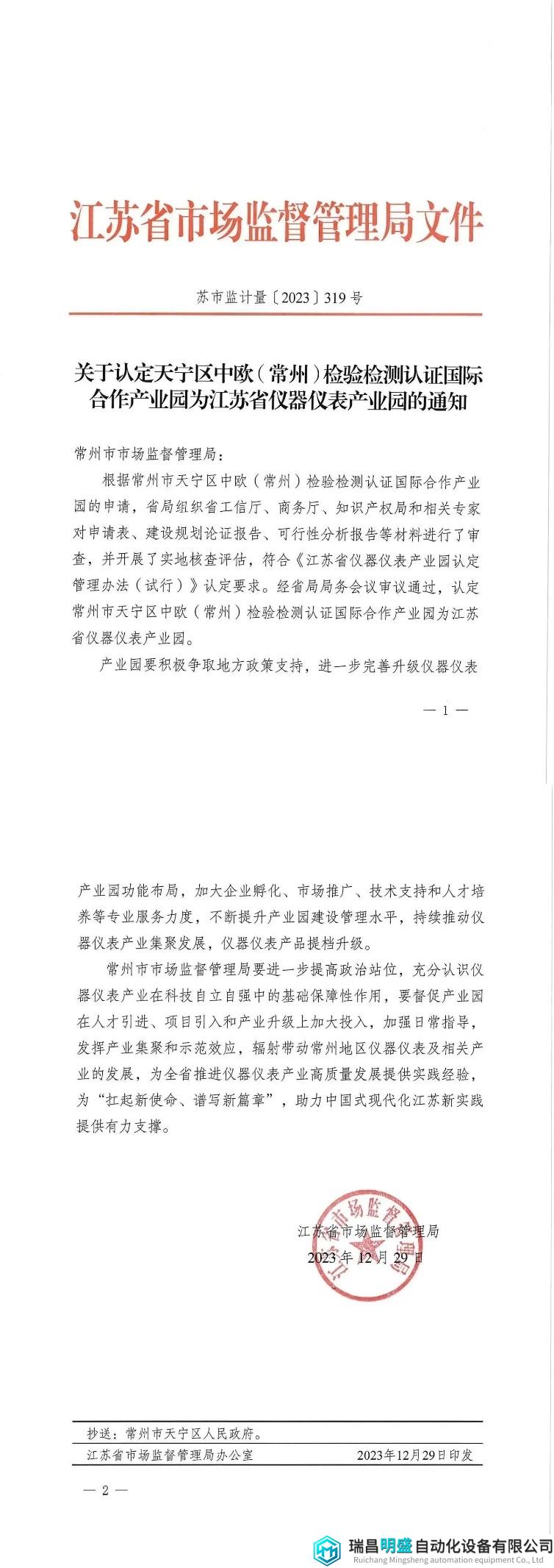 近日,江蘇省市場監(jiān)督管理局發(fā)布了蘇市監(jiān)計量【2023】319號文件,認定常州市天寧區(qū)中歐(常州)檢驗檢測認證國際合作產業(yè)園為江蘇省儀器儀表產業(yè)園。據悉,這是江蘇省第三家被認定的省級儀器儀表產業(yè)園。