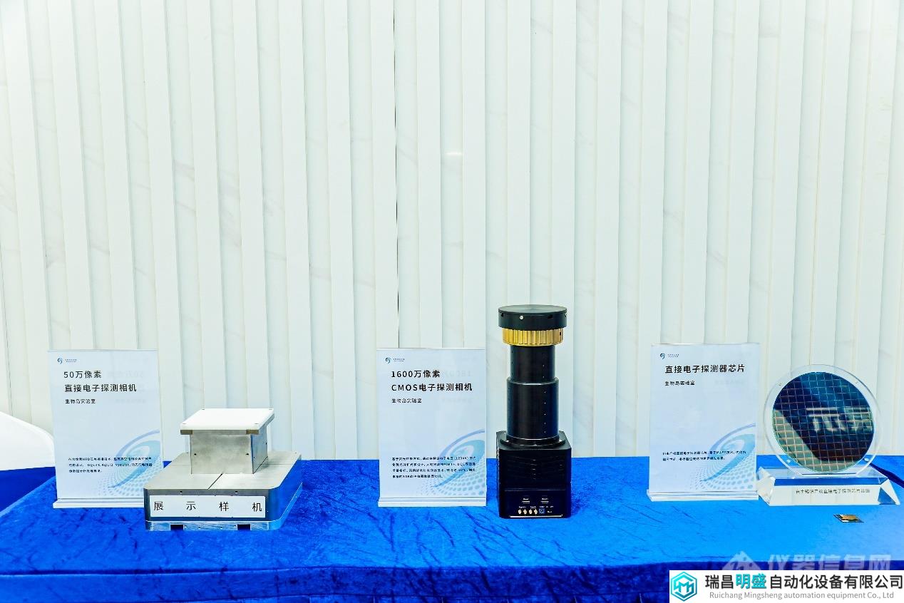 現(xiàn)場(chǎng)展示樣機(jī):50萬(wàn)像素直接電子探測(cè)相機(jī)(左)、1600萬(wàn)像素CMOS電子探測(cè)相機(jī)(中)、直接電子探測(cè)器芯片(右)