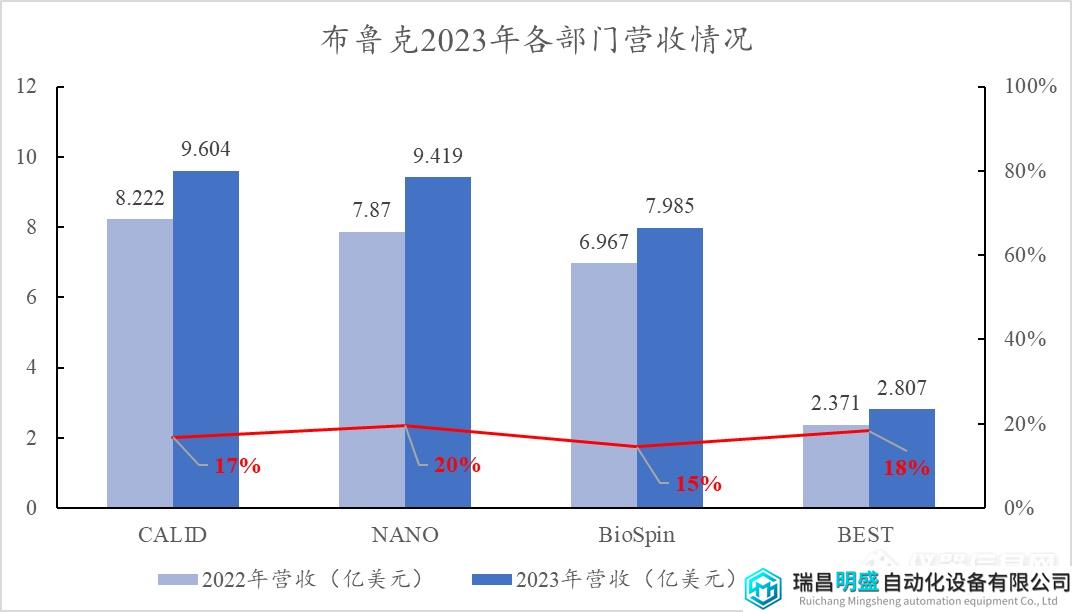 布魯克CALID 部門2023年?duì)I收為9.604億美元,同比增長(zhǎng)17%;Nano 部門2023營(yíng)收為 9.419億美元,同比增長(zhǎng)20%;BioSpin 部門2023營(yíng)收為9.419億美元,同比增長(zhǎng)15%;BEST部門2023營(yíng)收為2.807萬(wàn)美元,同比增長(zhǎng)18%。