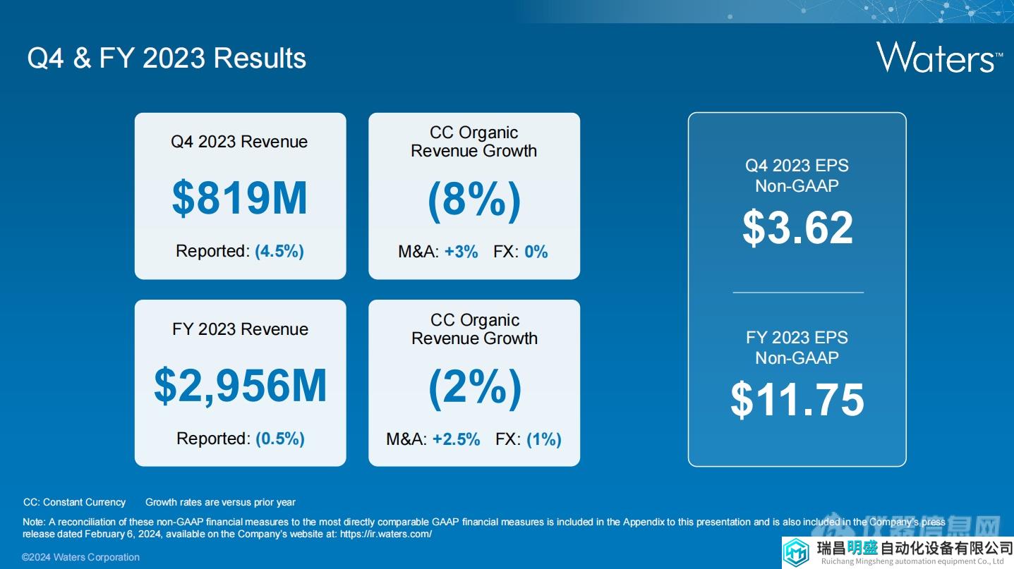 瑞昌明盛訊 近日,Water公布了其2023年第四季度及全年財報。Q4營收同比去年同期下降了4.5%,而全年營收同比下降了0.5%。