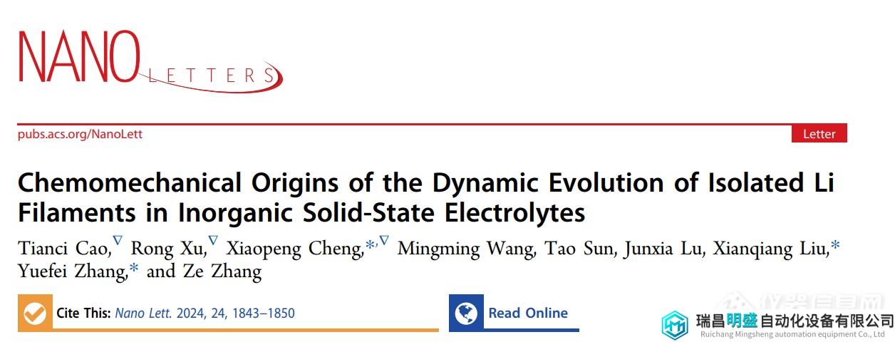 論文鏈接:Tianci Cao?, Rong Xu?, Xiaopeng Cheng*?, Mingming Wang, Tao Sun, Junxia Lu, Xianqiang Liu*, Yuefei Zhang*, Ze Zhang,Chemomechanical Origins of the Dynamic Evolution of Isolated Li Filaments in Inorganic Solid-State Electrolytes, Nano Lett. 2024, 24, 6, 1843–1850.