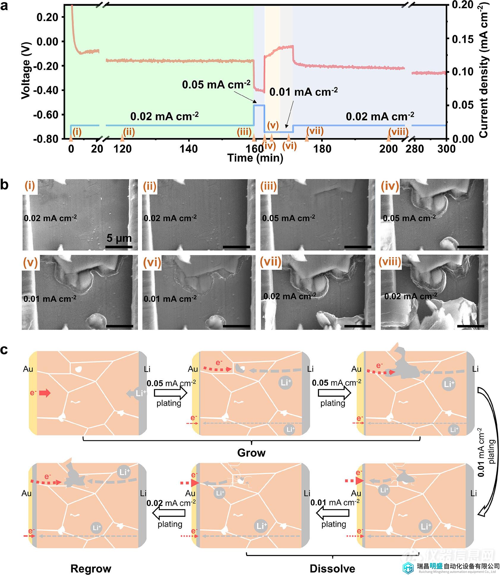 圖3 ?(a-b) 在迭代放電電流下,電池的電流-電壓響應(yīng)的演變和相應(yīng)的LLZTO截面形貌的SEM圖像變化過程。(c) 原位SEM實驗過程中SSE中內(nèi)部鋰“細絲”生長和溶解演變具體過程示意圖。