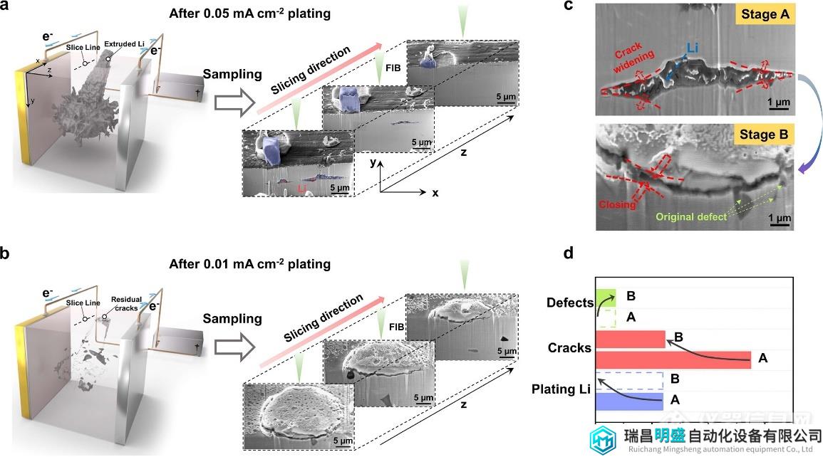 圖2 (a-b) 分別經(jīng)歷了0.05mA cm-2和0.01 mA cm-2電沉積過程后,LLZTO中的鋰“細絲”分布狀態(tài)變化和LLZTO深度方向內(nèi)部微結(jié)構(gòu)的形貌變化。(c) 0.05 mA cm-2電沉積過程后鋰“細絲”生長導(dǎo)致的電解質(zhì)撕裂以及0.01 mA cm-2電沉積過程后鋰“細絲”溶解導(dǎo)致的電解質(zhì)內(nèi)部裂紋閉合。(d) LLZTO內(nèi)部缺陷,裂紋和鋰“細絲”演變的對應(yīng)關(guān)系。