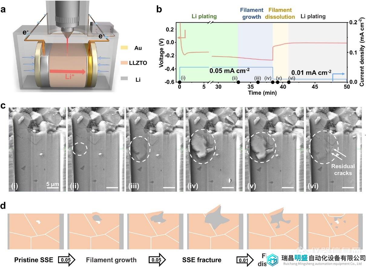 圖1 (a) 原位觀測SSE內(nèi)鋰枝晶生長的實驗裝置,(b-c) 電化學(xué)曲線中電流-電壓變化和所對應(yīng)的原位SEM中觀測到的無機固態(tài)電解質(zhì)鋰鑭鋯鉭氧(LLZTO)截面形貌演變過程。(d) 原位實驗過程中SSE內(nèi)部鋰“細絲”演化具體過程的示意圖。