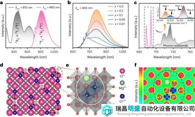該項(xiàng)研究發(fā)明了一種接近“性能完美”的高穩(wěn)定性MgO:Cr3?熒光透明陶瓷(中國(guó)發(fā)明專利,ZL202211147958.4),其寬帶近紅外發(fā)光發(fā)射峰值810 nm,取得了迄今為止的最高外量子效率(81%)。通過(guò)摻雜引入的Cr3?離子在Mg2?格位異價(jià)取代,使得結(jié)構(gòu)中存在豐富的陽(yáng)離子空位缺陷,形成了不同局域環(huán)境的Cr3?發(fā)光中心。與此同時(shí),發(fā)光中心之間的聲子輔助激發(fā)態(tài)能量傳遞過(guò)程,彌補(bǔ)了長(zhǎng)波長(zhǎng)發(fā)射的非輻射弛豫,克服了能隙率的影響,提升了發(fā)光效率。進(jìn)一步得益于MgO熒光透明陶瓷所具有的超高導(dǎo)熱率,在22 W/mm2藍(lán)光LD泵浦下獲得了超過(guò)6 W的寬帶近紅外輸出功率,光轉(zhuǎn)換效率達(dá)29%。