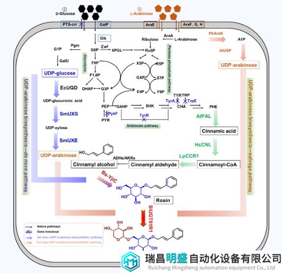 目前為止,國內(nèi)外科研人員針對紅景天苷的合成開展了大量工作,中國科學院天津工業(yè)生物技術(shù)研究所劉濤研究員團隊先后在2014年和2018年發(fā)表了“Production of salidroside in metabolically engineered Escherichia coli”、“Metabolic engineering of Saccharomyces cerevisiae for high-level production of salidroside from glucose. J Agric Food Chem”的論文,為發(fā)酵法生產(chǎn)紅景天苷技術(shù)工業(yè)化奠定了重要基礎;2018年,天津大學的趙廣榮教授和喬建軍教授將紅景天苷的生物合成途徑分配在兩個大腸桿菌株中,進行了深度代謝改造,實現(xiàn)了紅景天苷高效人工合成,產(chǎn)量是以往單菌生產(chǎn)的20倍以上。
