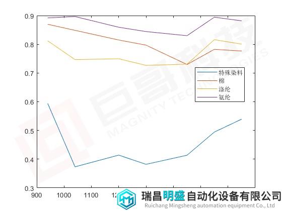 使用短波多光譜相機(jī)對(duì)不同材質(zhì)的四類布料(滌綸、氨綸、棉以及使用了特殊染料的布料)進(jìn)行成像。使用多光譜相機(jī)采集到的四類布料光譜數(shù)據(jù)如下圖所示,可以看出不同材料在光譜上的差異。