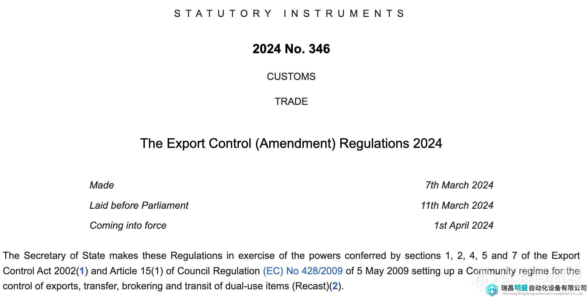 瑞昌明盛訊 2024年3月11日,英國政府發(fā)布新的修訂條例,即《2024年出口管制(修訂)條例》(“修訂條例”),更新了《2008年出口管制令》和保留的《歐盟軍民兩用條例》【相關(guān)鏈接】。