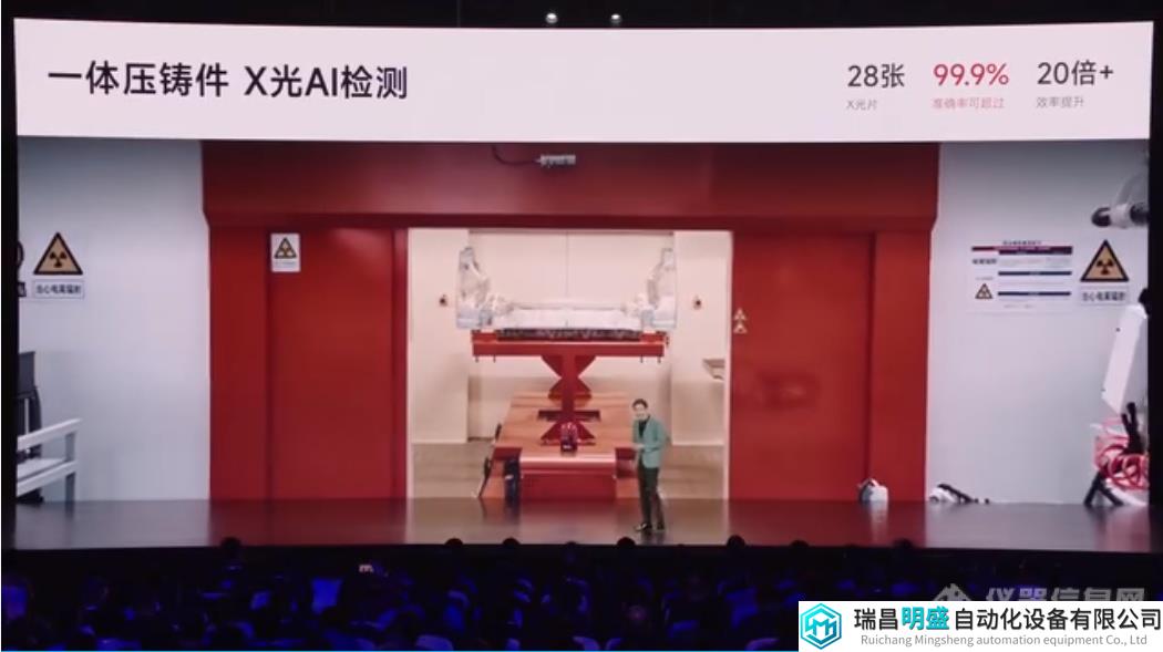 小米方面宣稱,視頻中的X-Eye智能質(zhì)檢系統(tǒng)為其自研,但小編根據(jù)設(shè)備外觀及以及行業(yè)內(nèi)常識(shí)大膽猜測,該大型一體壓鑄件X射線智能檢測設(shè)備來自國內(nèi)工業(yè)X射線領(lǐng)域某頭部企業(yè)。該X射線探傷儀可為每個(gè)一體壓鑄后地板自動(dòng)拍攝28張X光片,借助AI系統(tǒng)檢測人眼不可見的內(nèi)部缺陷。