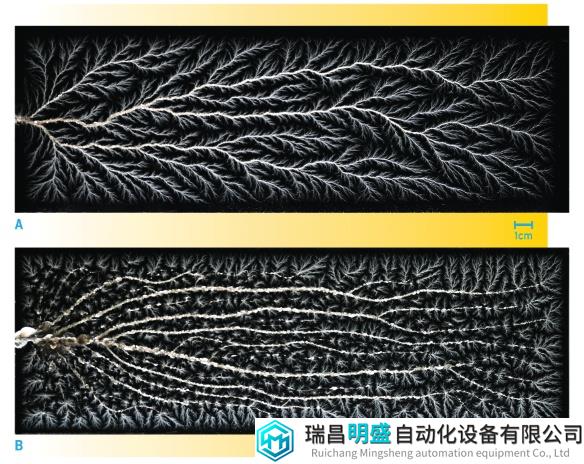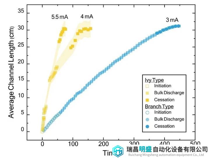 常春藤型放電模式與傳統(tǒng)的分支型放電模式存在顯著差異。通過實驗觀察,發(fā)現(xiàn)常春藤型放電的通道形成速度超過107米/秒,而分支型放電通道的形成速度為106米/秒。這一發(fā)現(xiàn)表明了電介質擊穿過程中的不同機制及其復雜性。
